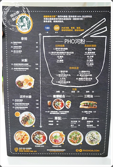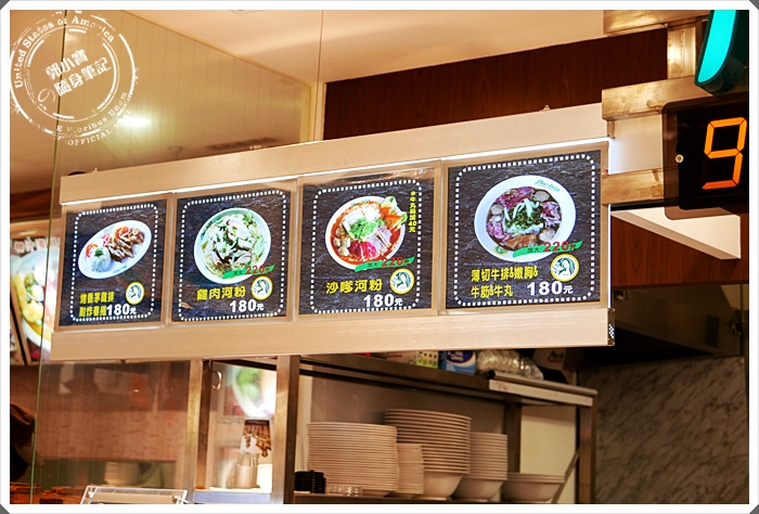 | 菜單還滿可愛的,只是如果有老花眼可能會看不清楚XDDD,中間再差畫麵碗當中的是所有提供的河粉種類,總共有16種選項非常多,一律都是180,加大的是220價格。 |