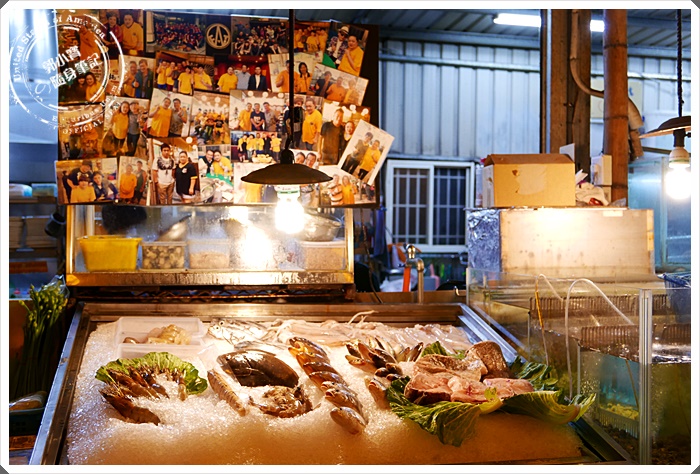 | 前方櫃台有許多新鮮的漁獲,上頭還擺著與許多名人的合照唷~旁邊也有超多蔬菜種類。 |