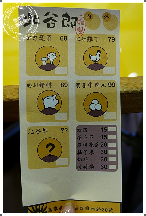 | 菜單設計很可愛,而且發現價格非常平易近人,寶妹點了好野蔬菜根暖暖湯,W哥點了旺財雞丁跟洛神花茶,目前主餐搭飲品跟湯品都有折價喔,而且打卡還送柚子凍,菜單上的問號是會時時更新的神祕咖哩。