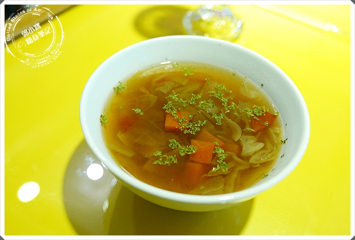 | 暖暖湯,意味著開胃暖身,是以番茄跟蔬菜熬煮,類似義式蔬菜湯,可惜入口鹹味稍重,蔬菜的清甜跟番茄的酸味都沒有表現出來,有努力空間。 |