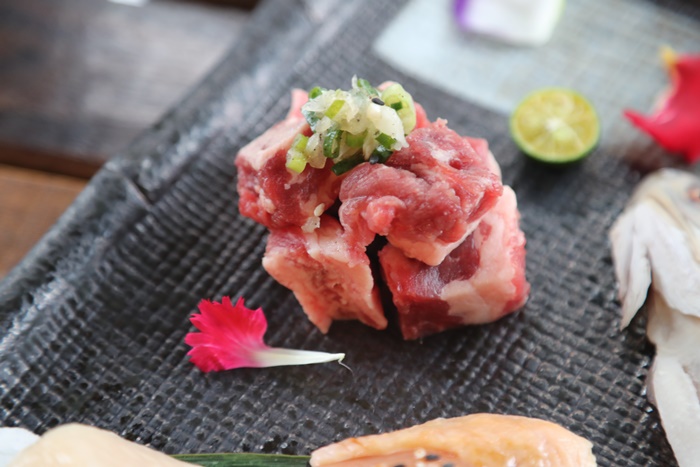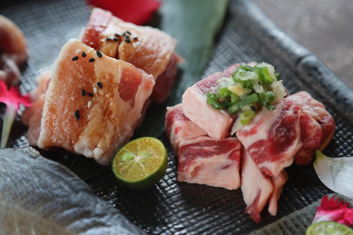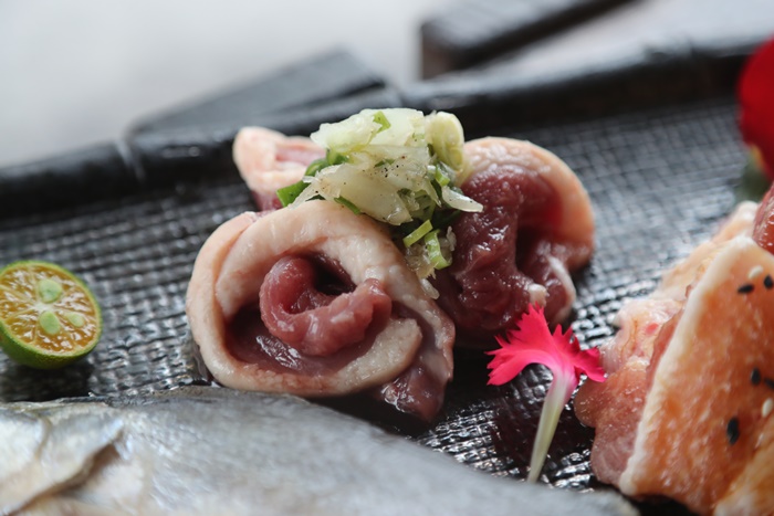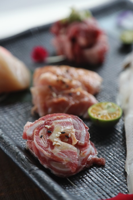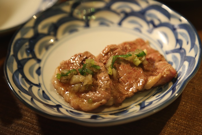 | 今晚都是店主幫我們烤的,我跟朋友兩個人就是聊天慢慢品嘗一片一片烤好的肉品,淺嚐著一些清酒,真的是太享受了,櫻桃鴨胸烤起來真的很好吃,感覺很像牛肉。 |