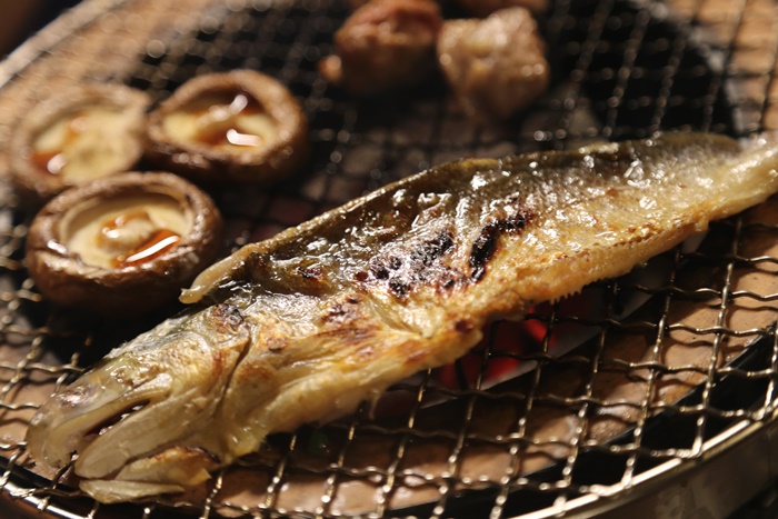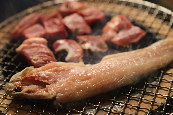 | 午仔魚一射干的肉相當的厚實,放上烤網後一整個香氣十足。 |