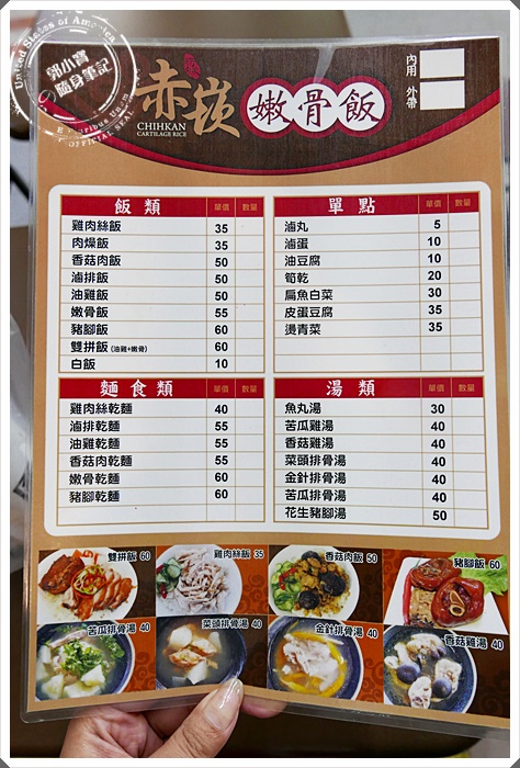 | 因為招牌會反光不好拍,直接拍餐單給大家看,飯食部分真的很平民價,豬腳飯價格也才$60元,35起跳就有雞肉絲飯,湯品的部分也有很多選擇!