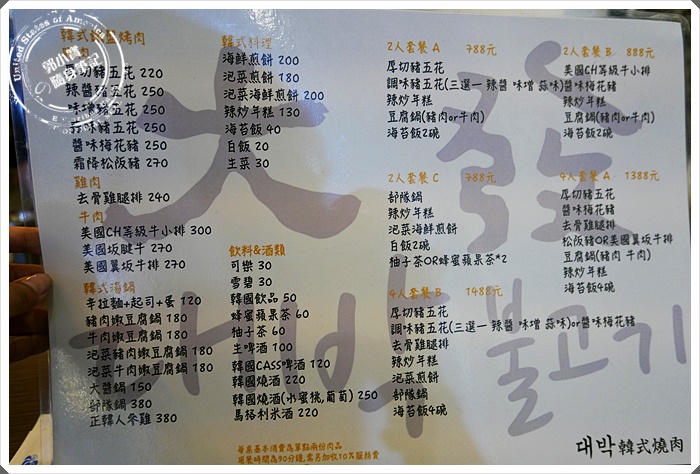 | 再來是大家一定最關注的價錢以及價目表,右邊是單點的價位,左邊兩排則是套餐式的價位,為什麼寶妹會推薦,主要是上網看發現大發的套餐相當超值,兩人套餐只要788,加上服務費一個人絕對不用超過450!這在選擇韓式燒肉上相當的超值,所以才讓我忍不住約了W哥一起來試試阿~ |