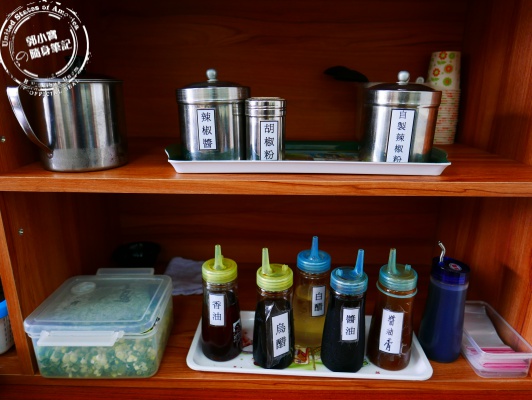 | 調味料中最特別的就是這店家自製的辣椒粉了,可惜小編不識貨啊沒有嘗到它厲害之處,後來聽老闆家人推薦,【自製辣椒粉+香油+烏醋】這樣的組合沾水餃好吃,下次小編再去試其它水餃時會試試這特別的沾醬。 |