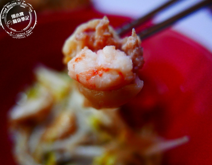 | 紅油抄手裡面都會有一大塊的蝦仁,吃起來除了有口感外還多了蝦的鮮甜味。 |