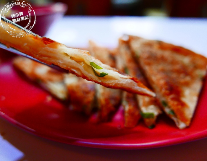 雖然店家的名稱是鍋貼王,但小編每次都任性的點招牌之一的蔥油餅,因為他們家的蔥油餅真的太特別了,蔥都夾在中間部分,外面的皮很酥脆有嚼勁,加上胡椒香氣,整個是就非常鹹香夠味。 |