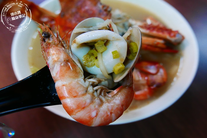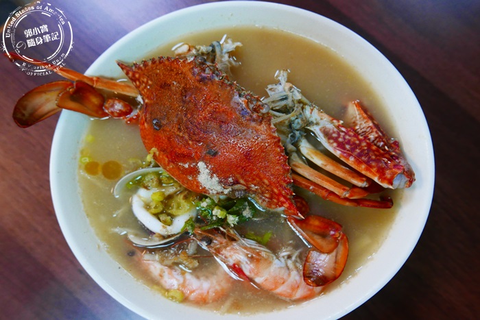 | 上頭就擺了一整隻螃蟹超級霸氣,這一碗份量其實夠兩個人吃,裡面的蝦子比較大,有花枝蝦子蛤蠣,配料很豐富,湯頭屬於比較濃郁口味比較重,粥是像飯湯那一種的,讓飯吸收了湯汁變的很有味道,加上因為有大量的海鮮,所以整碗很有大海的味道。 |