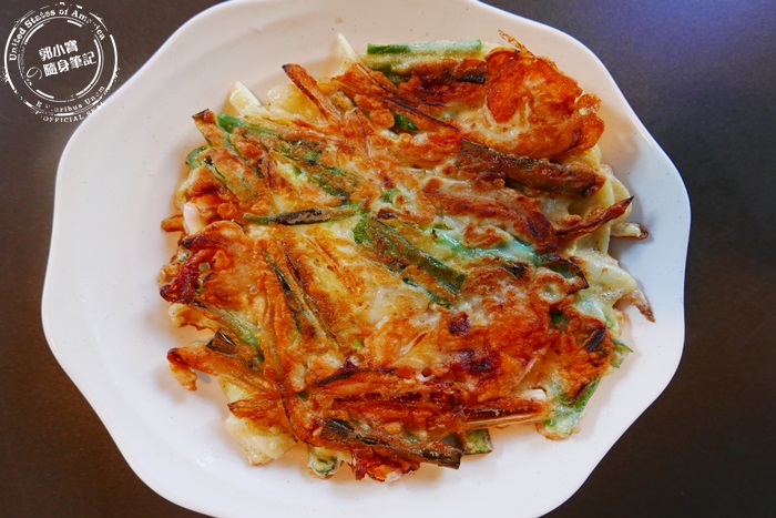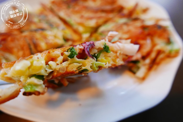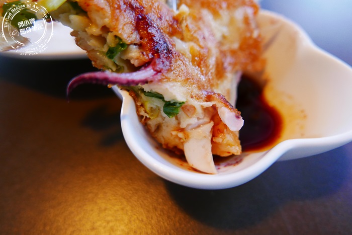 | 厚度有兩公分厚的海鮮煎餅,裡頭有滿滿的蔥跟大量肥厚的花枝,外表煎得酥酥脆脆,麵糊微微有彈性,花枝的軟Q蔥香的濃郁,一口咬下非常厚實非常飽足香氣四溢,配料層次豐富好吃。 |