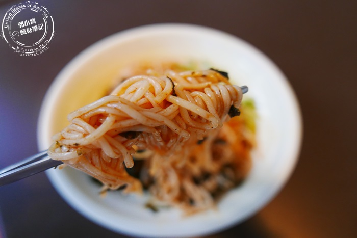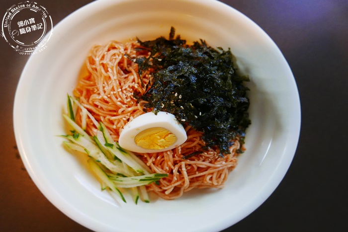 | 新菜色,所以點來吃吃看,很適合夏天的一道冷食,將麵調味過混合海苔絲跟小黃瓜絲,海苔濃濃麻油的鹹香味還有黃瓜的清脆,麵帶辣度但不會不舒服,原本以為是很Q很有彈性的麵,但是口感是像麵線那樣子,沒有那麼Q是屬於比較粗的麵線的感覺。 |