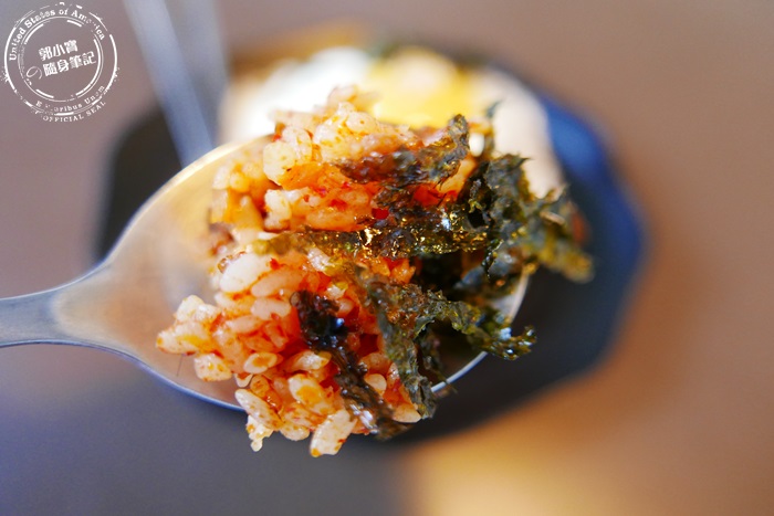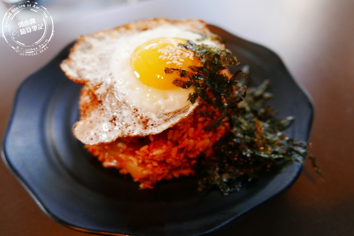 | 加了泡菜下去半炒過的飯,又酸又辣非常夠味, 加了韓國海苔獨特的麻油香氣味道更提升,裡面也有些許的豬肉絲增添口感,上面再放上一顆太陽蛋,沒有熟的蛋黃與炒飯混合在一起,多了滑順感更香濃,非常夠味又飽足的一道料理。 |