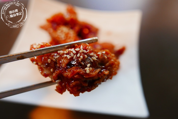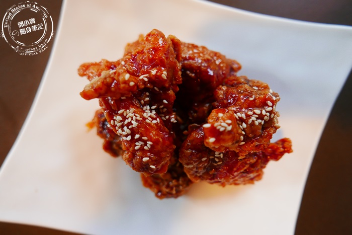 | 他們家的炸雞外表裹的粉炸得非常酥脆,獨特調出來的醬汁辣得很舒服帶酸甜味解膩開胃還很順口,又香又辣的超過癮,一口咬下鮮嫩多汁,要趁熱吃才很有juice感,點綴的白芝麻增加香氣,品嚐到韓劇常出現的韓式炸雞真的超幸福的。 |