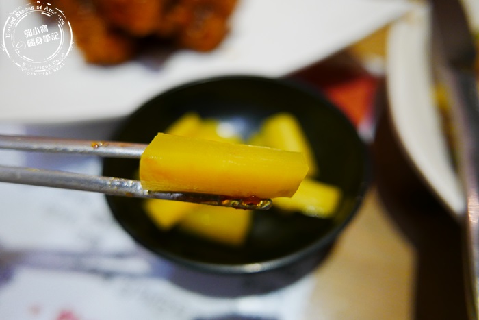 店家會附上醃蘿蔔,帶脆感的蘿蔔醃過後多了酸甜味在嘴裡會回甘,跟炸雞搭配超適合,吃上一口醃蘿蔔就像是把嘴裡味道清空一般,清爽又解膩很不簡單的醃蘿蔔。