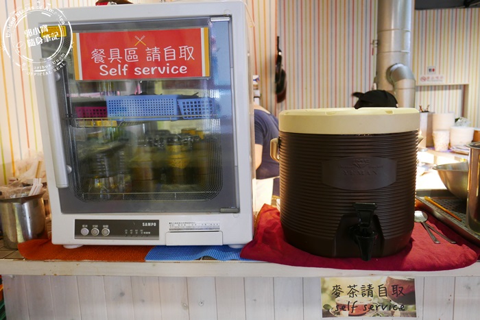 | 店裡面採自助式的,點完餐後就可以到餐具區去拿餐具,餐具都放在高溫消毒殺菌箱裡,衛生乾淨, 旁邊有提供的熱麥茶,好養生的感覺。 |