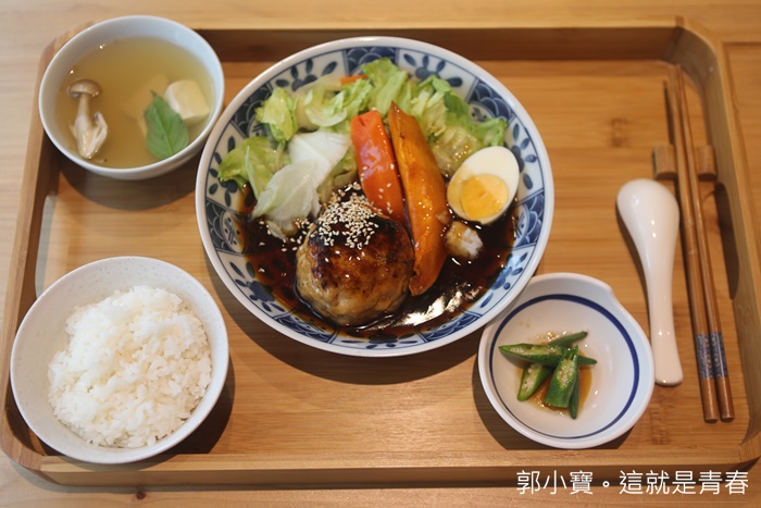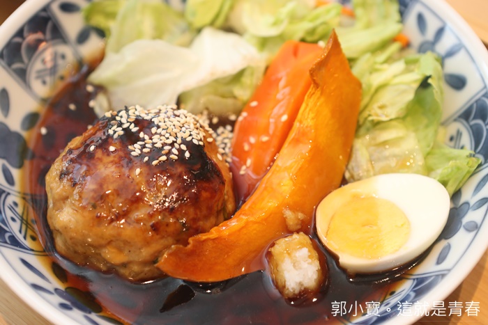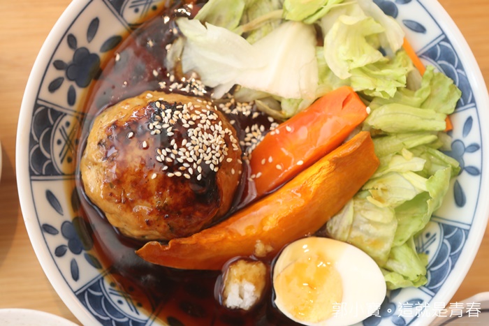 | 除了虎鰹漢堡排以外,主要是通常家長都會煩惱小朋友比較不喜歡吃魚,加上怕魚骨有時沒挑乾淨小朋友卡在喉嚨那真的是一場災難,完全打成漢堡牌後又加上帶點甜度的照燒醬一整個就是小朋友喜歡吃的,另外盤內還有生菜跟一顆糖心蛋,顏色配起來相當的豐富,瞬間讓人食慾大開。 |