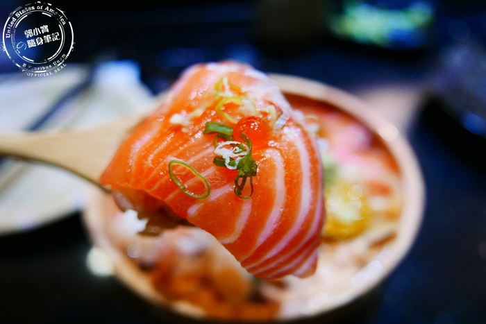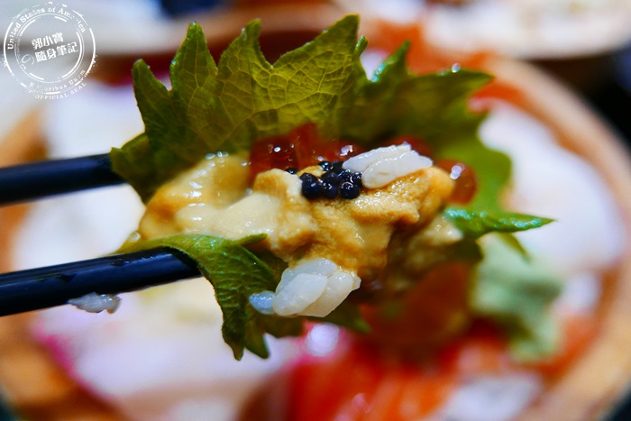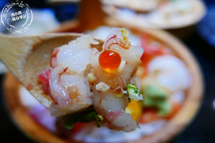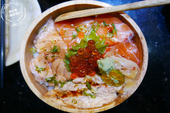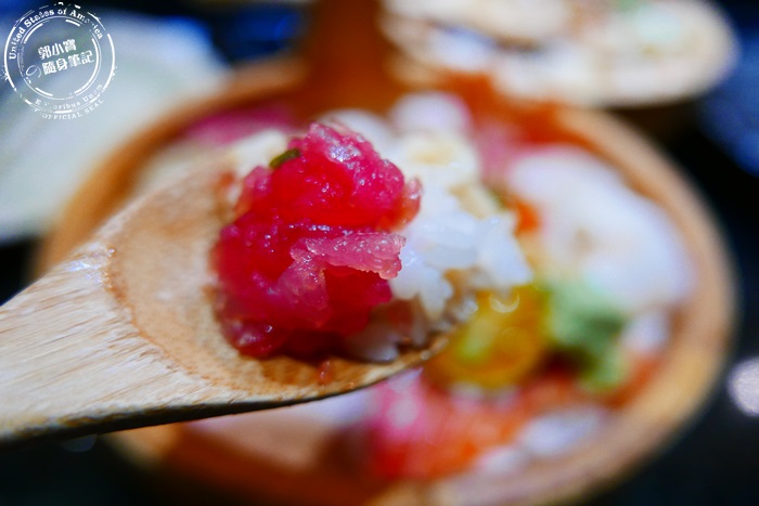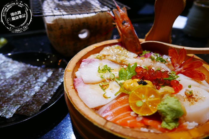 | 木盆裡先鋪滿壽司米飯再蓋上滿滿的海鮮生魚片,一上桌就非常吸睛豪華又澎湃,這價位這樣的享受非常值得,而且份量也非常剛好。 |