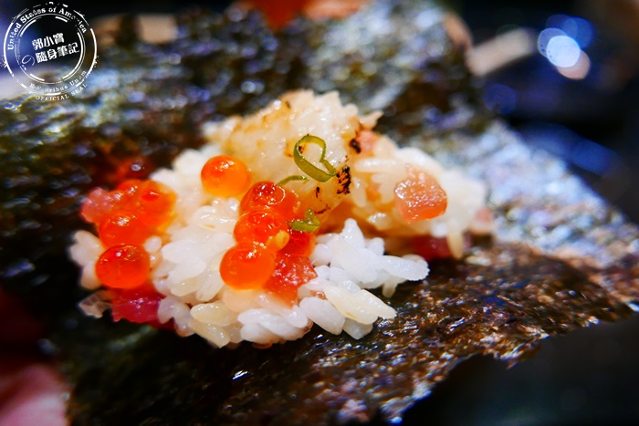 | 刮成泥處理過的鮭魚肉,軟軟黏黏嫩滑的口感配上壽司米飯的Q彈,很搭配又特別,鮮甜味十足,再加上些許的鮭魚卵爆出大海的味道增加些許鹹度,超好吃。 |