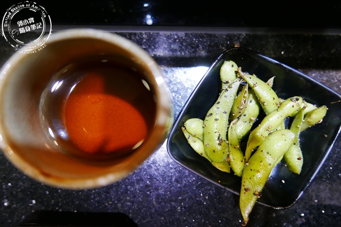 | 招待的冷盤小菜-毛豆,簡單水煮然後調味的毛豆,外頭裹著黑胡椒的香氣,不會太鹹再帶點毛豆原本的甜,綿密的口感豆香跟胡椒香,在嘴裡簡單又滿足,一點點食物入口胃口就開了,每次點的餐還沒來之前都會覺得小菜不夠吃哈哈XD |