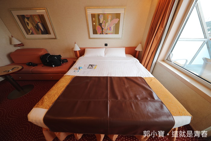 | 就連房間裡面就掛了很多藝術品的畫作,我這次的床鋪是雙人大床,COSTA歌詩達幸運號也有提供兩張雙人床的房型,旁邊是超好躺的大沙發,根本就是還可以睡一個人的大床了,沙發很軟很好坐,但是沙發最後都變成我的雜物放置區。 |
