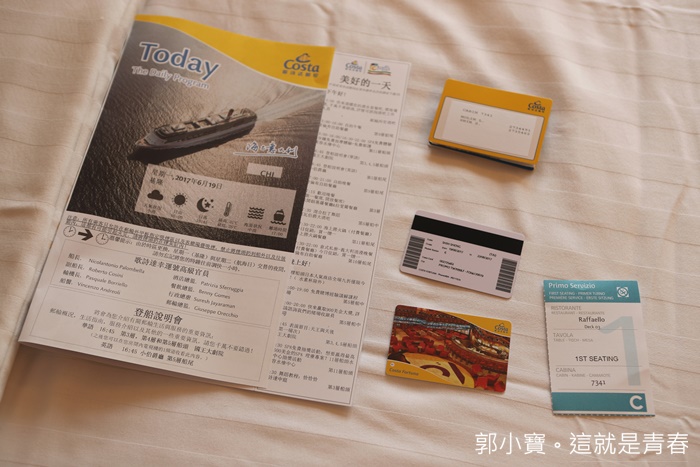 | 進入房間的時候就可以看到COSTA歌詩達幸運號的簡介資料還有每天會置換的行程卡,最重要的就是這一間房卡阿,記得馬上先去辦理房卡跟信用卡結合的程序,還有一開始房間都沒有鎖,所以一定要記得自己的房號,我個人就曾經跑錯房間還滾了床,最後才發現是別人的房間,行李服務人員會直接放進房間裡面,如果你比較早進房鎖起房門的話,行李就會放在房間門口。 |
