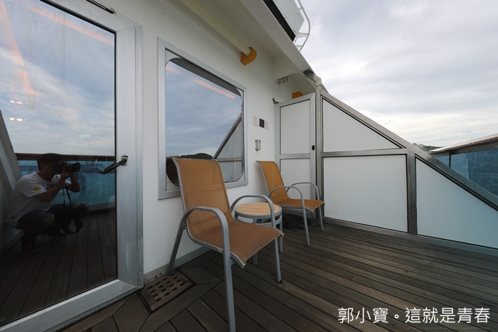 | 我房間的海景戶外大陽台,因為這次我入住的地方在床尾,所以陽台特別的大,可以看到180度的超級美景,船側陽台跟船尾陽台看到的美景真的不同,尤其日昇日落的時候那美麗的折射光線真的讓人嘆為觀止! |