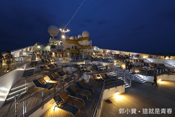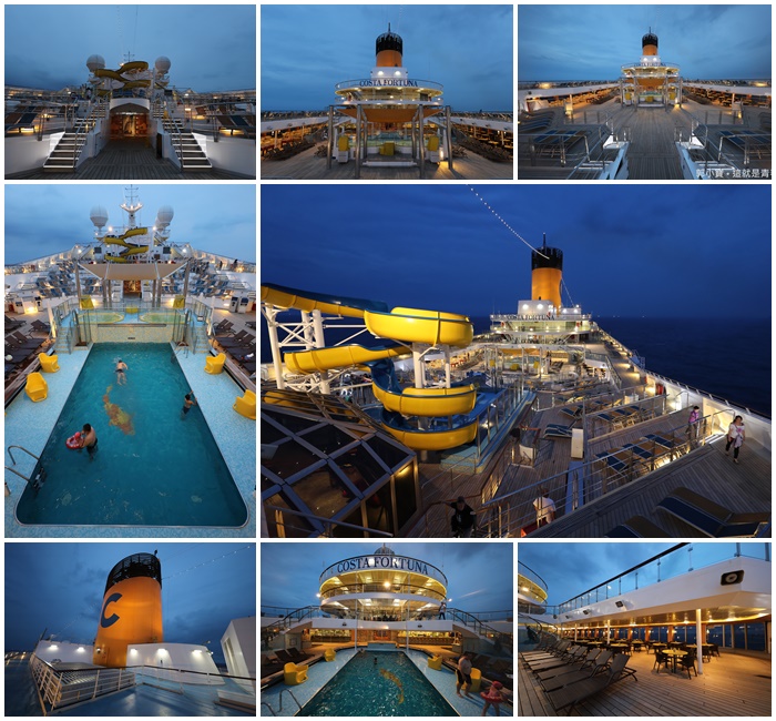 | 接下來帶大家看看我最喜歡的露天大泳池,這也是COSTA歌詩達幸運號戶外最大的一個區域,也是平常早上最多人的地方,但是因為怕拍到太多人,有的人不喜歡入鏡,所以我選了第一天上船人少的時候趕緊去拍,光是這大面積的樓層式躺椅就讓我覺得超級美的,喜歡日光浴的朋友真的不用怕搶不到躺椅,後面就是COSTA歌詩達幸運號最讓小朋友跟年輕人喜愛的高空滑水道。 |