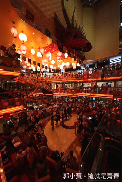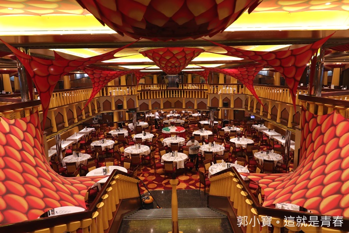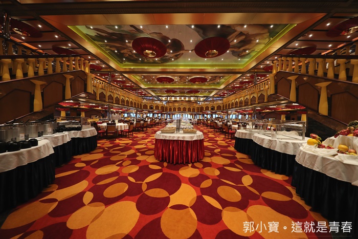 | 這超大又豪華的餐廳一連三個樓層,最上面的一層樓式海上撈火鍋屬於付費餐廳,其他兩層都有連接前後的泳池餐廳,這邊一整天從早到晚到消夜任何時間來幾乎都有東西可以吃,早餐早午餐午餐下午茶晚餐及消夜一天六七餐,養豬之旅就從這邊開始! |