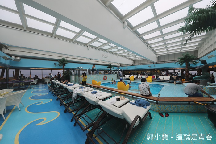 | 如果你不喜歡曬太陽的話,那船尾的部分還有一個泳池,這船尾泳池跟11樓自助餐廳是相連在一起的,所以一邊吃飯一邊眼睛吃冰淇淋也是不錯的選擇啦,這邊船尾餐桌的陽光相當充足,我超喜歡在郵輪上選個窗邊的位子,欣賞海洋的景色。 |