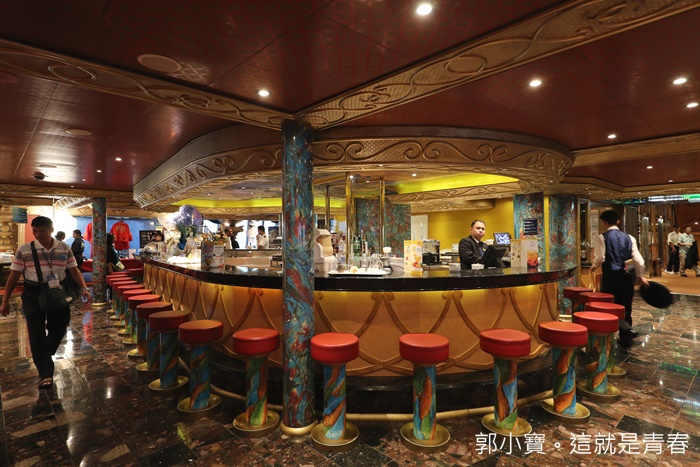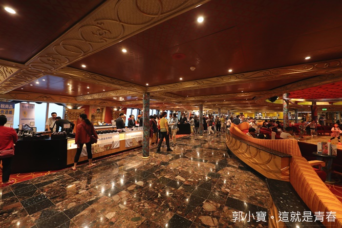 | 這酒吧大廳你一定要認為,因為只有這一層樓才能貫通前後船甲板,通往賭場跟購物商城等等都一定要經過這酒吧大廳,也是一整天室內活動都排滿滿的地方,這邊也是限時免稅購物推出的集散地,所以沒事真的要常常來逛逛,有時候推出的免稅品真的很值得入手,加上這邊也是販售船上飲食跟飲料眷的主要場地,很多人跟親友相約集合的最佳場地。 |