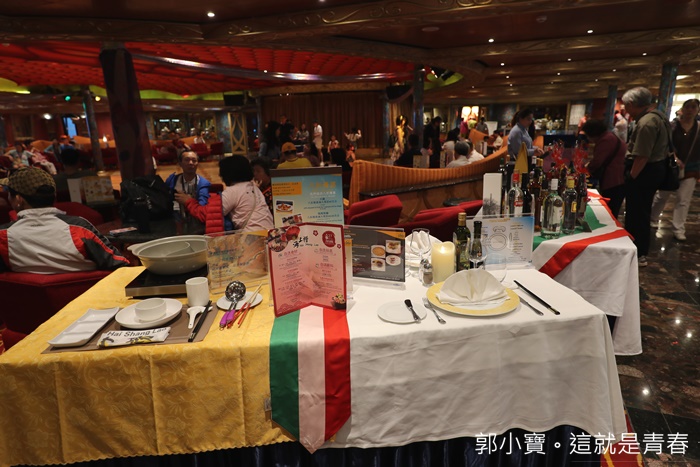 船上很受歡迎的餐廳,主要以西餐義大利麵為主,都是採用單點吃到飽的方式,排隊的人潮很多,等候的時間也比較久了一點,不過幸運號在這方面控制的還滿好的,船上總共分為兩個餐期,剛入船進入房間的時候,床上就會有一個卡片告知你所屬的房間是屬於哪個餐期,這樣的分流制度避免了人潮瞬間的擁擠也可以顧好用餐品質,唯一沒有分餐期的就是自助餐廳。 |