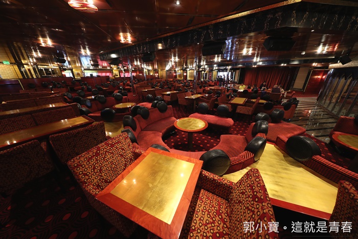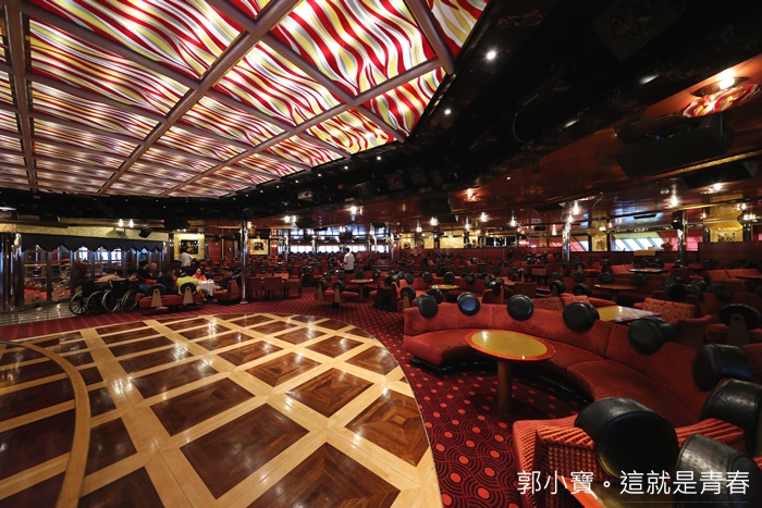 | 五樓船尾的酒吧是獨立的空間酒吧,裡面收藏了很多耳熟能想的畫作以外,沙發座位也都非常舒適,座位數相當的多,還有一個滿大的舞台,最後也變成了台灣大叔大嬸團的舞池場所,只要有燈光音樂跟舞台,每個地方都可以是舞池,不過上郵輪就是要這樣,最主要就是讓自己放鬆,想喝酒就喝酒,想跳舞就跳舞,想打麻將就打麻將,每個人都做著自己喜歡的事情。 |