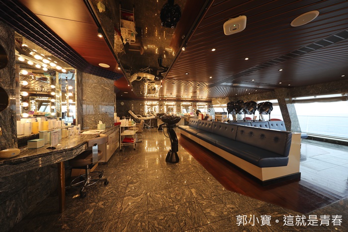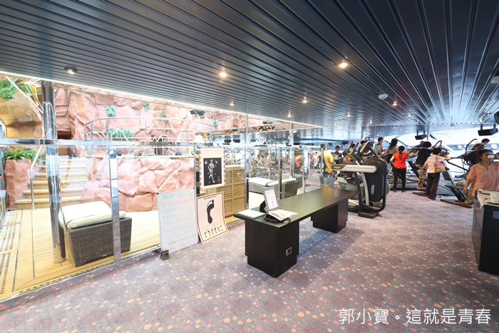 | 健身房剛好就在頂樓的船頭,所以前方的落地窗透明玻璃就可以居高臨下眺望海景,健身房一整天的人都超多的,除了健身房以外還有三溫暖等設施,現場也都有專業的教練一旁協助。 |
