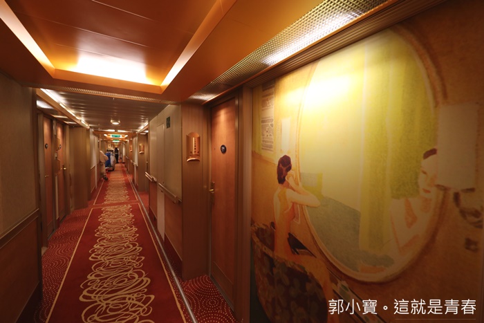 | 房間樓層的部分地毯都打掃得很乾淨,走道上每一層樓也都有不同的彩繪風格,走在通道裡面感覺也不會搖晃,COSTA歌詩達幸運號算是大型郵輪所以很穩,怕暈船的人基本上也不用太擔心。 |