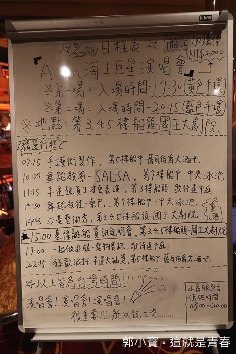 | 除了COSTA歌詩達幸運號每天都匯給節目活動表以外,有些節目也會特別在大廳白板服務台上告知,看看這一天滿滿的各式各樣活動,原諒我真的沒辦法一一到達拍攝,加上活動一直在推陳出新,所以我只能大致上跟大家分享環境跟主要活動。 |