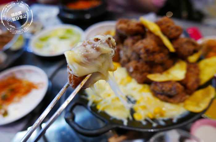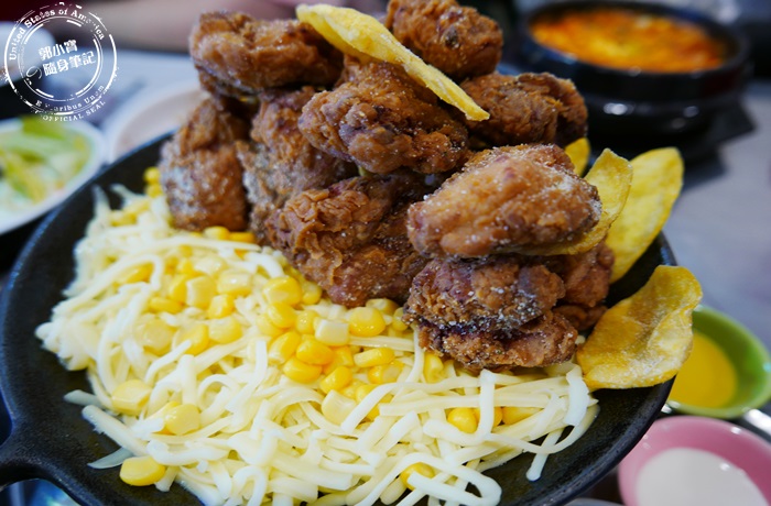 看看這起司融化的畫面太逼人了,將炸雞用起司包覆著,濃濃奶香的起司再搭配一點點的玉米粒,香甜柔軟整個人都融化了,店家的炸雞都是雞肉塊,而且很鮮嫩多汁,外皮的粉也沒有裹的很厚,雞肉塊因為有先醃過炸過之後有撒上一些胡椒粉調味,所以其實單吃味道就滿重的,熱騰騰的炸雞咀嚼起來還帶有起司的香氣,吃這道就是暫時別管熱量,除了炸雞還有炸薯片,炸薯片是地瓜還有撒上梅粉,可以單吃綜合一下嘴裡的味道,或是再挖取更大量的起司往嘴裡塞,都是看個人喜好而定,不過這起司炸雞鍋真的太厲害了,對滿滿的炸雞山跟融化的起司讓女孩為之瘋狂的好味道,這道如果人多來吃真的可以點來試試。