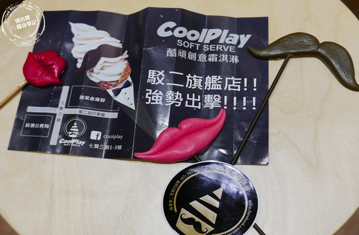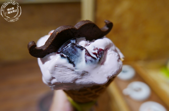 | 他們家在駁二也有分店,霜淇淋再貼上翹鬍子,下方的甜筒紙是紳士裝造型,感覺就是穿著衣服的冰淇淋,太吸睛太好拍了,下方圓圈圈造型的是貼紙,也是店家設計的名片,非常可愛又特別。 |
