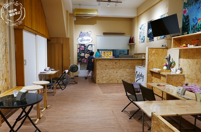 | 座位四周都有翹鬍子造型的抱枕,可愛,雖然不是有很大的舒適度,但就是好玩又好拍,座位上方也是很多裝飾品,有日式風格的還有台灣經典大同寶寶,反正無違和感,好看也好拍,牆上有店家大大的Logo,整個感覺非常的夏威夷風。 |