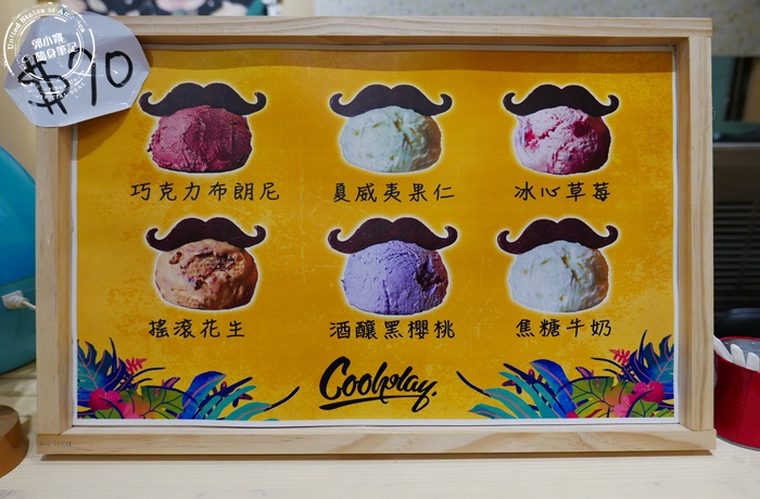 | 霜淇淋目前沒有供應,櫃檯上方有目前冰淇淋的口味,有圖片有價錢,每球冰淇淋上面都有店家最具代表性的翹鬍子,好可愛啊! |