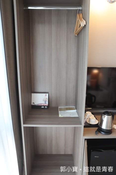 | 床鋪的對面就是一個開放式的小衣櫥,可以放置雜物或是衣物非常方便,小桌子上就是電視跟書桌,書桌可以放上一台筆電沒有問題,電源插孔也足夠,冰箱就在書桌的下方,空間運用的剛剛好。 |