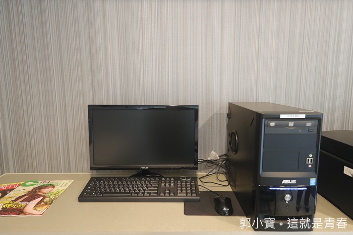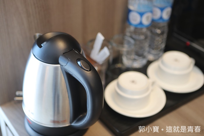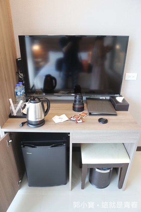 | 書桌的一旁放著礦泉水跟熱水壺還有茶杯,麻雀雖小但是面面俱到,加上房型超便宜的讓我一整個舊超推薦! |