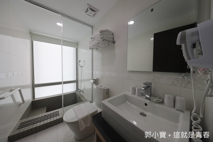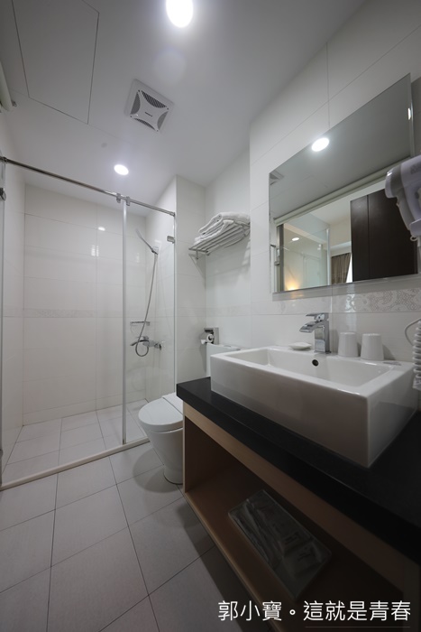| 浴室空間頗大,吹風機都是壁掛在浴室內的,簡單明亮的浴室讓人部會覺得擁擠,權管理面只有精緻四人房的部分有泡澡的空間。 |