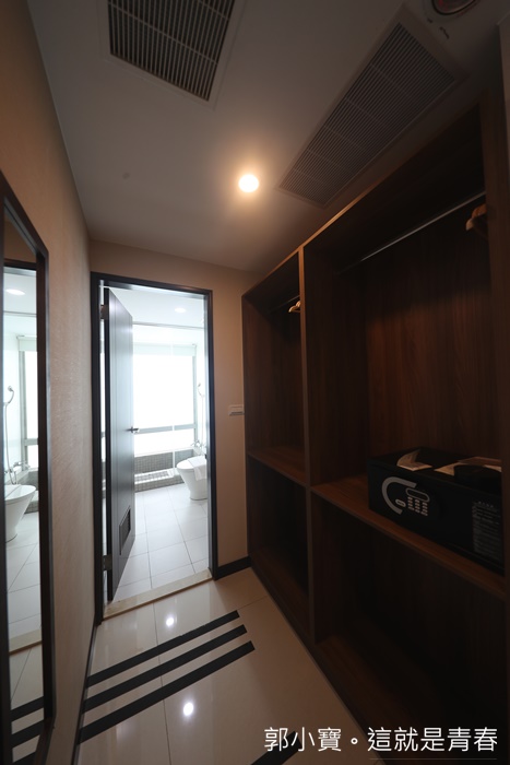 | 因為邊間的關係,所以空間相對大很多,長廊一邊都是衣物間,可以放的衣物也比較多,樺舍的衣物櫃幾乎都是設計成開放式,還有提供一個電子保險箱,長廊的盡頭就是浴室了。 |
