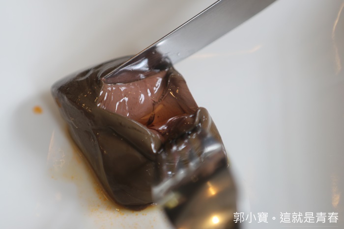 | 果凍鴨血吃起來尚可,還不算到最好吃的鴨血,但是有的人超愛這種口感的果凍鴨血,喜歡吃果凍鴨血的朋友有福了,這邊的果凍鴨血並沒有無限續加,果凍鴨血的部分單點一份是200元,用刀叉吃鴨血真的非常特別,但是單點的高價火鍋要挑戰消費者鴨血要單點這一部份是一個非常大的考驗。 |