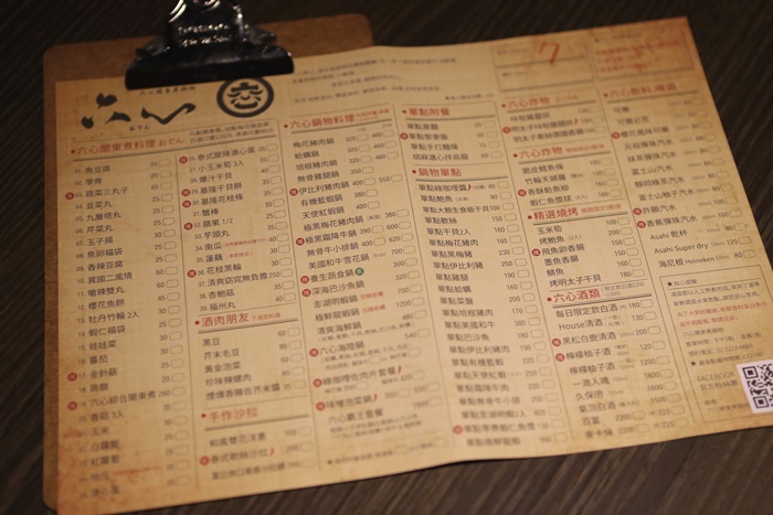 | 菜單上琳瑯滿目的品項,不管是關東煮區還是鍋物都分的很仔細,後來才知道六心也有很多私房料理沒有在菜單上,很多客人都是跟他們說他今天的預算讓六心去配菜,也可以算是私廚的一種嗎XD? |