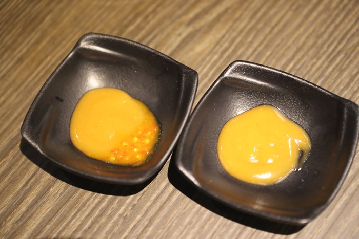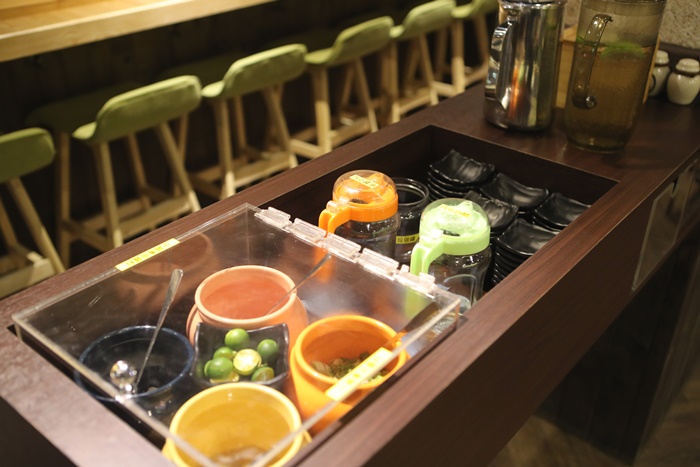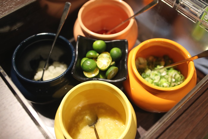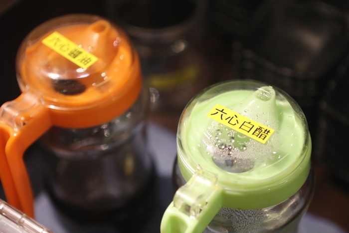 | 調味料除了大根泥還有辣椒根蒜泥、蔥以外,最特別的是還有金佶,提供醬油跟白醋。 |