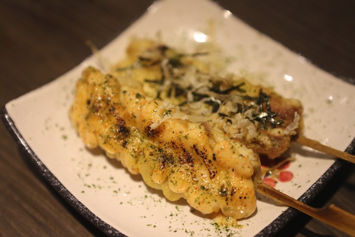 我個人很喜歡這道菜,咬下去有一點像是炸麵包,帶點脆硬的滋味很不錯,上面的口味一個是明太子醬,很好吃,另一個海苔絲口味。 |