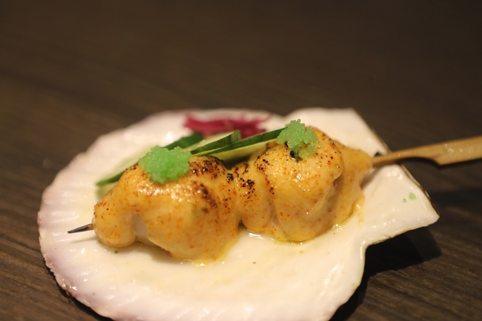 擠上明太子醬的干貝還滿適合白酒的小點。 |