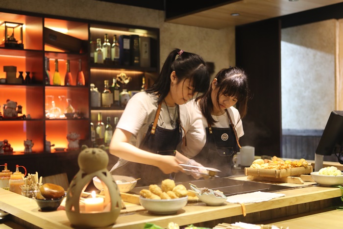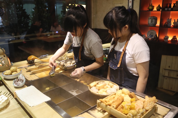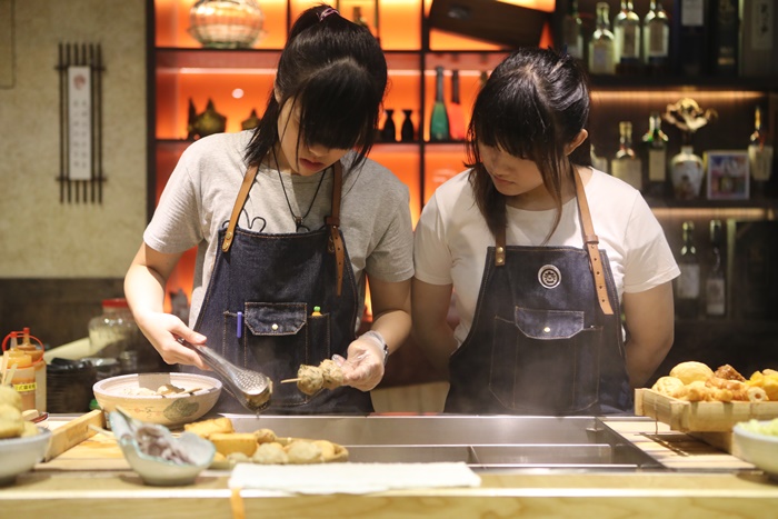 | 兩個妹妹正忙著烹煮關東煮,把容易煮爛的食材先夾起來,等客人點後再放到湯裡熬煮加熱,店員說它們的湯頭不是一般的黑輪湯,它們是用大骨熬煮許久的高湯,沒有添加其他調味。 |