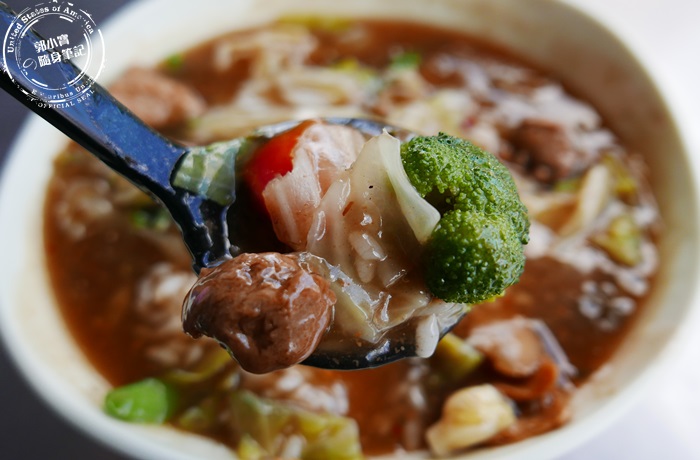 | 底層鋪大量的白飯,在淋上熱炒的食材勾芡,芡汁不會太濃太稠,與飯攪拌均勻後,米飯的口感還在,一樣香Q,沒有因為泡了湯汁就變的太軟,紅燒的芡汁香氣濃郁,大量蔬菜讓湯汁超鮮甜清爽,濃郁滑順的口感,芡汁搭配白飯超有味道,會不自覺的一口接著一口吃。 |