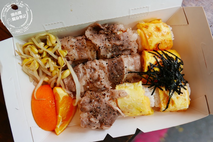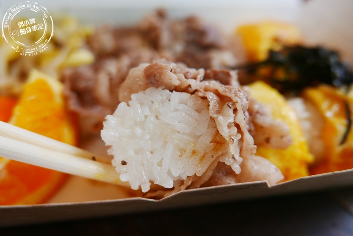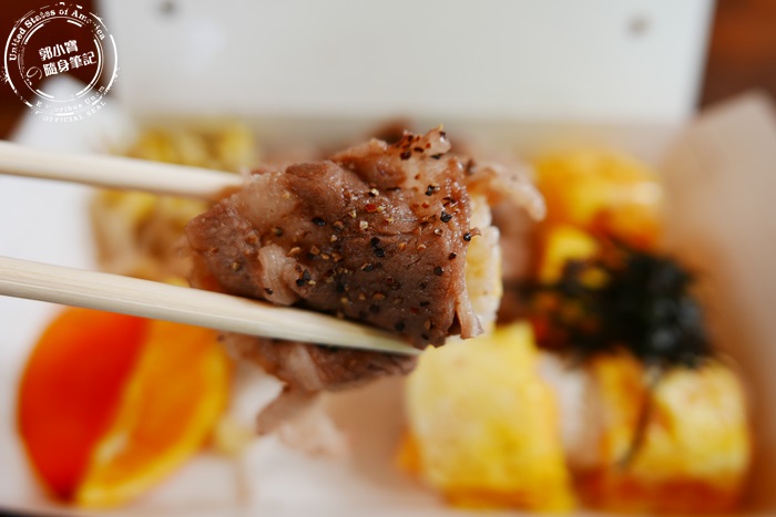 | 打開餐盒除了讓人很驚艷之外,每顆飯糰相當的討喜,像這個椒鹽牛,就是將的雪花牛肉片現煎過後包覆蓋住飯,最外層撒上一點鹽巴跟胡椒就很夠味,將一顆飯糰拿起來沉甸甸的,單手真的很難HOLD住,要一口塞也要嘴巴夠大才行。 |